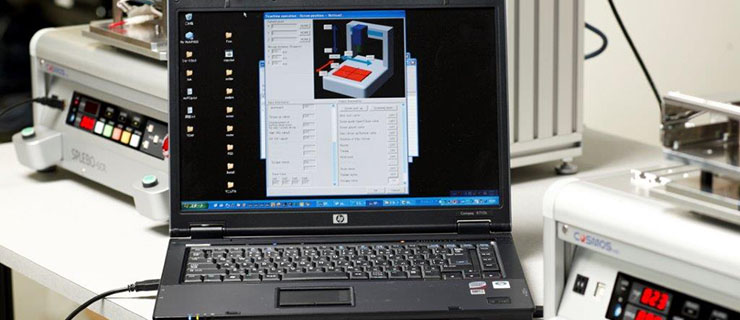 現在力を入れているのが、自社開発の卓上ロボットです。ロボットの複雑な動きは、アームの位置情報や動きの経路、速度などの情報をあらかじめ登録し、ロボットの動作を組み立てる「ティーチング」でコントロールします。独自に開発したパソコン用のアプリケーションで簡単にティーチングができるので、ロボットの動きを自由に設定、変更することができます。