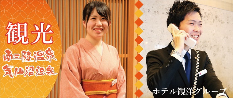 私たちホテル観洋グループは、南三陸・気仙沼でホテルを経営しています。海がもたらす四季折々の豊かな魚介類は、三陸だからこそ味わえるものとして、食のシーンでお客様の旅を演出しています。客室・温泉から臨む大パノラマの海原はいつも穏やかにお客様をお迎えします。三陸の輝く海の景観をステージに、スタッフ一人ひとりの笑顔のおもてなしがお客様の心に届いた時、「ありがとう」という心に響く感謝の気持ちが返ってきます。お客様へ届けたい思いが、仕事の中で動作の一つひとつに込められており、その思いの集合体こそが私達「ホテル観洋グループ」のブランドです。 観光ホテル3館: 南三陸ホテル観洋、気仙沼ホテル観洋、気仙沼プラザホテル(宮城)