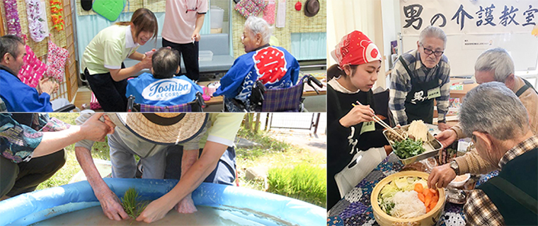 各事業所では、ご来賓やご家族を招いて開催する敬老会や、夏祭り等の苑内行事の開催のほか、ご利用者のニーズを支援するため、外出やふれあいの機会を作ります。また、地域の介護にかかわる諸問題を解決するため、介護教室の運営やスタッフ・講師派遣を行っています。