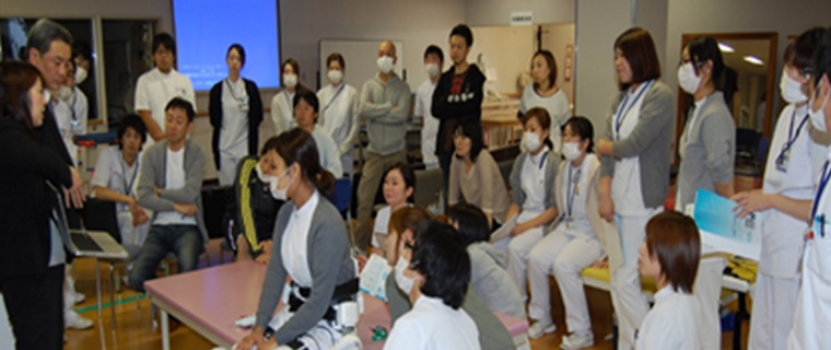 職場は、職員と患者・利用者が相互に学び成長する場であると位置づけ、定例の研修会、実技勉強会、症例検討会、伝達講習会等の研修会を定例的に開催しています。また、入職時は、全職種での新入職員合同研修として法人事業、就業規則、接遇などの他、リハビリテーション部独自に評価・治療の技術研修を行っています。