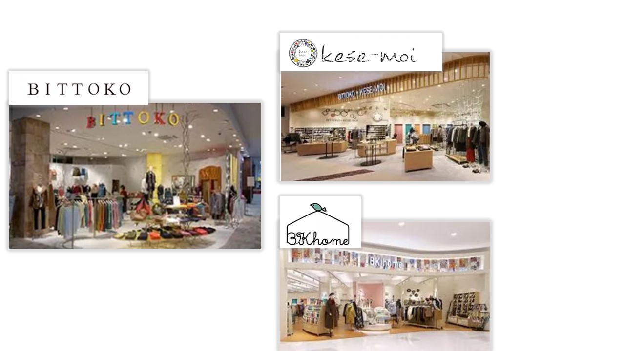 大人の女性の美しさ、強さを引き立てるファッションを提案する「BITTOKO」、フレンチテイストをベースにしたライフスタイルストア「kese-moi」、レディースウェアと生活・キッチン雑貨、インテリア家具で生活に彩りを添える「BK home」の3つのオリジナルブランドをプロデュース。2020年は新たに飲食事業も展開をはじめました!