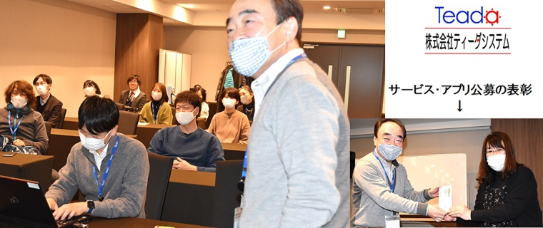 お客様先(仙台市内)で仕事をしているメンバーや東京在住のメンバーもいますので、3ヵ月ごとに全員が揃う会議を行っています。ここでは経営ボードや各セクションからの報告はもちろんのこと、テーマを決めたサービス・アプリアイディア公募や資格取得など表彰、また親睦会(コロナ禍で現在休会中)からイベントの発表など、様々な情報共有を行います。休憩時間にはお菓子を囲んで会話も弾みます。