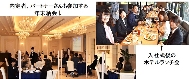 社員の親睦と活性化を目的としたイベントを企画運営する「親睦会」はコロナ禍で休会していますが、入社式&ランチ会、歓迎会、内定式、年末納会はコロナ感染予防対策を講じて行ってきました。特に「年末納会」は例年、社員はもちろんのこと、仕事をお願いしているパートナーさんと内定者の方々も参加しており、安心して入社式を迎えることができると毎年好評です。季節イベントや社員旅行復活の声も高まってきました。