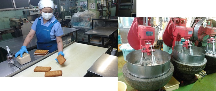 少人数の職場ですから、みんな和気あいあいの雰囲気で仕事をしています。ただし、品質へのこだわりがありますから、製造に妥協はありません。ねり工程、手づくり等製造については、ベテランの職人が丁寧に指導します。出荷作業では10Kg程度の製品を扱いますので、ある程度の体力を要します。