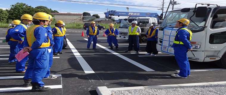作業前のTBM(ツール・ボックス・ミーティング)の様子です。前日までの作業の進捗状況等を全員で共有してその日の作業を円滑・安全に行う為に実施します。この他に、年に2回安全大会を開催して、社員や協力会社全員で安全衛生にかかわる知識を深め、意識作りを行っています。