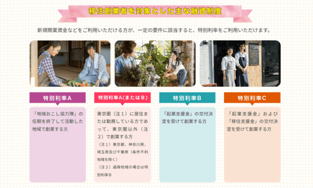 日本公庫 国民生活事業では、「新規開業資金」などのご融資を通じて、地方に移住して新たに事業を始める方のお手伝いをしております。一定の要件に該当する場合、特別利率をご利用いただけます。